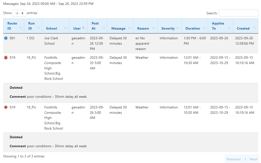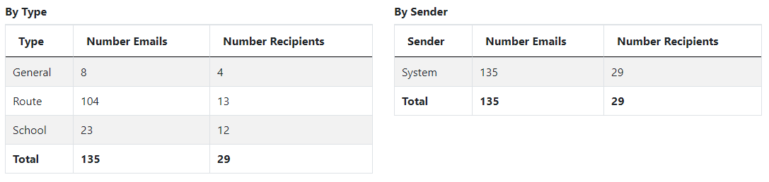 Subscriber Statistics tells you how many subscribers bus stops, routes, runs, schools and general notices have. It also shows which email addresses are subscribed. 1.Either browse to the statistics you wish to see (using the paging at the bottom,) or use the Search: to find a specific school ID, bus stop ID, run ID or route ID.